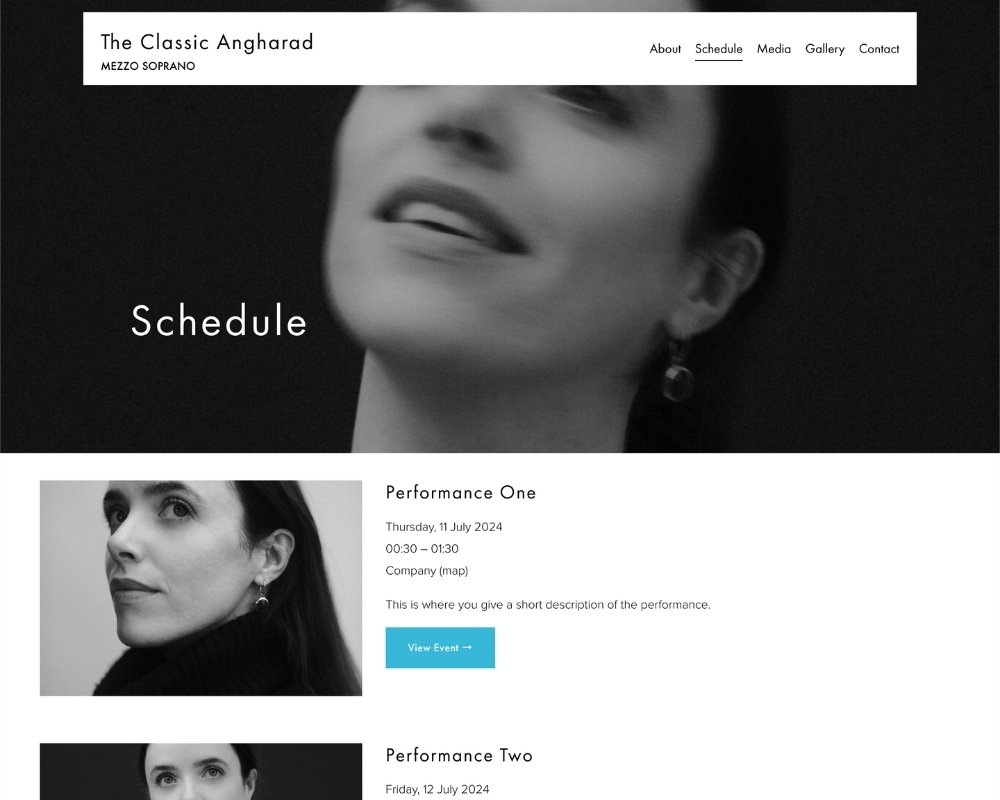 Time to add your logo (if you have one), your brand colours, your upcoming performances, gallery, videos, contact details, whichever best showcases your work.